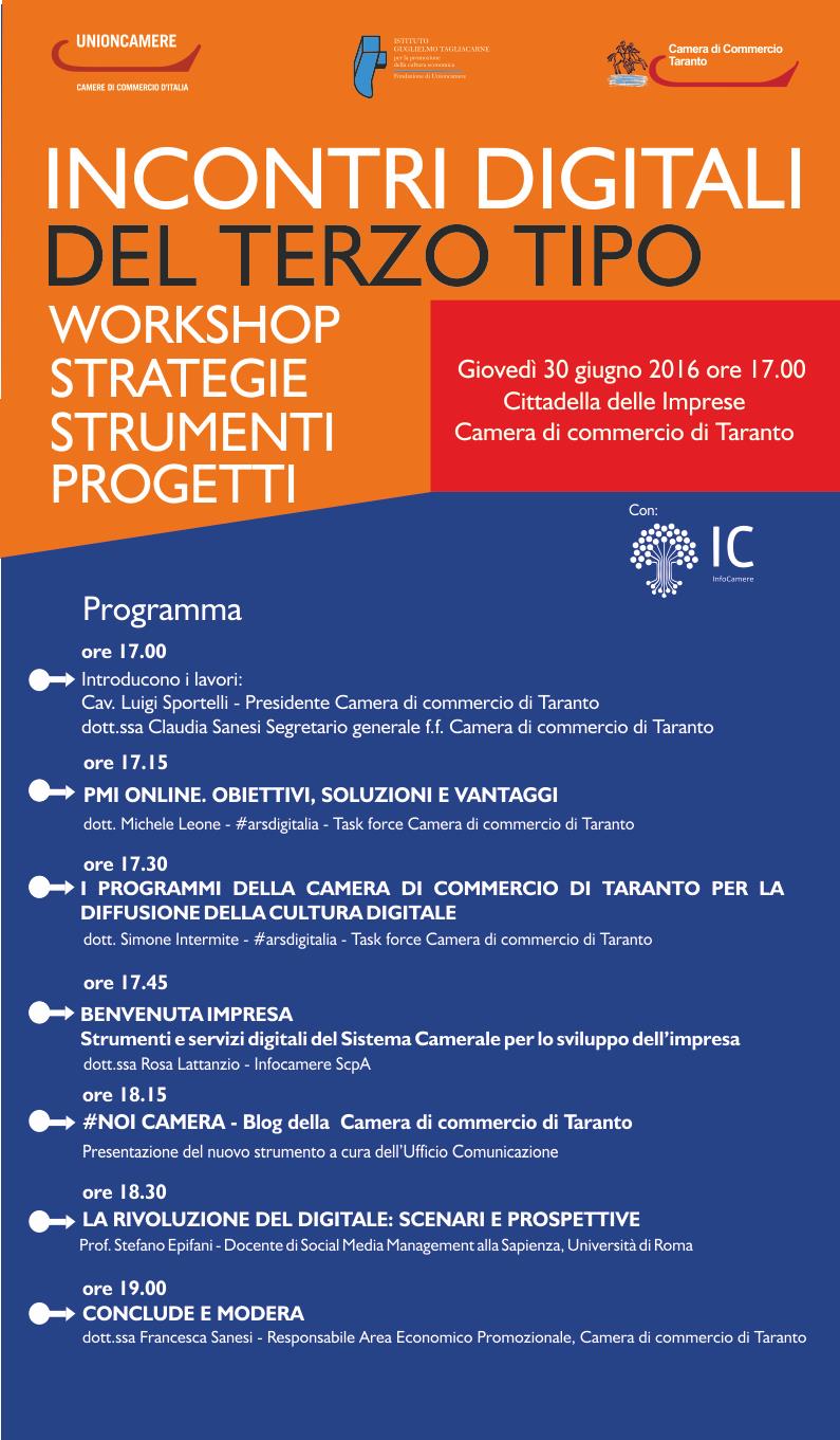 28.06.2016 – "Incontri digitali del terzo tipo. Strategie, strumenti, progetti" – Workshop. Giovedì 30 giugno 2016 h.17, Sala Monfredi della Camera di commercio di Taranto... Leggi tutto