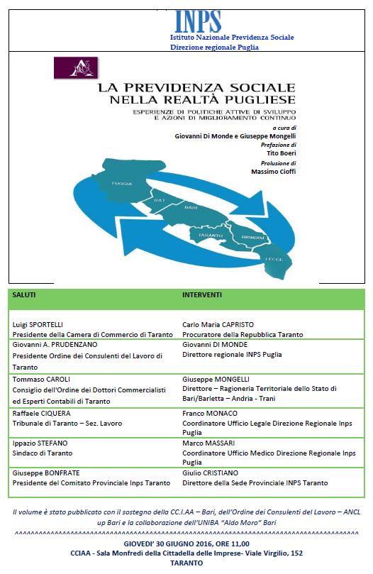28.06.2016 – "La Previdenza sociale nella realtà pugliese. Esperienze di politiche attive di sviluppo e azioni di miglioramento continuo"- Presentazione del volume a cura di Giuseppe Mongelli e Giovanni Di Monde. Giovedì 30 giugno 2016 h.11, Sala Monfredi della Camera di commercio di Taranto... Leggi tutto